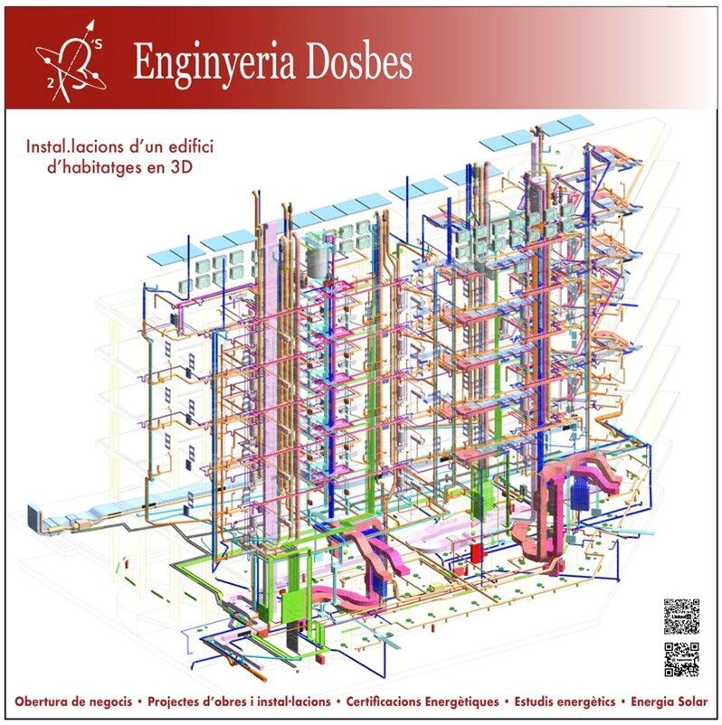 En la següent imatge es poden veure les instal·lacions de l’edifici en 3D de climatització, ventilació, aigua, electricitat, sanejament, telecomunicacions i contraincendis.